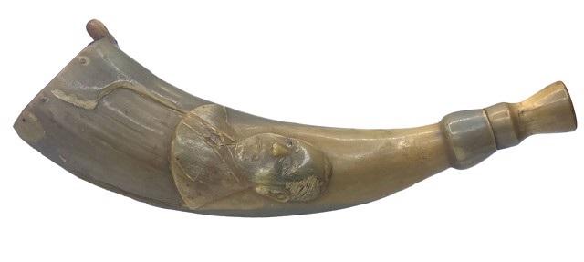 DS-68: Carved blond, blowing horn with artist's portrait and fox; carved landscape on horn end.,c.1915 carvedhorn 12x2.50in