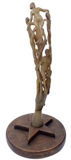 DS-77: Vertical blond carved and pierced horn sculpture with nude women in tree, on wood base with star.,c.1915 CarvedHornonwoodbase 14x7in