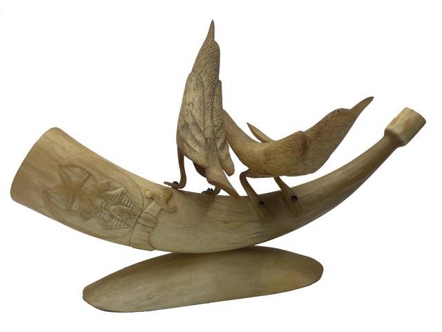 Dan Super DS-61: two carved birds standing on a horn, masonic sword, c. 1915 carved horn