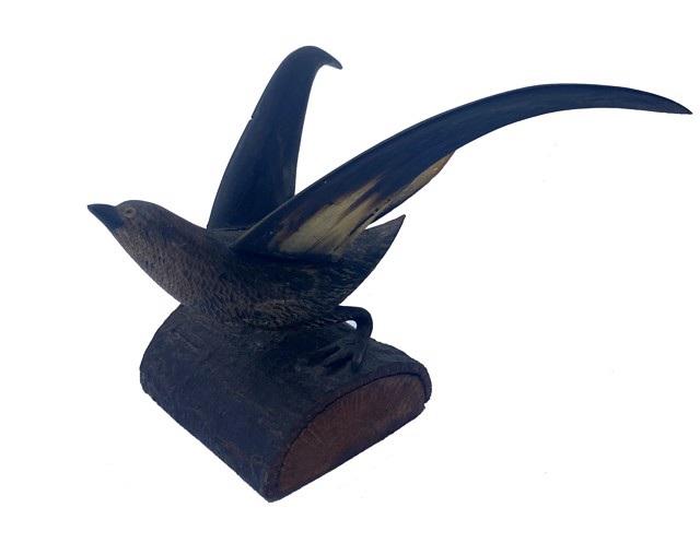 DS-47: large dark carved horn bird with long beak on horn base,c.1915 carvedhorn 7.50 x2.50 in