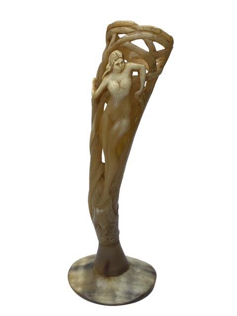 DS-81: carved and pierced horn vessels on horn base; art nouveau stylized nudes standing with trees,c.1915 carvedhorn 8x3x3.50in