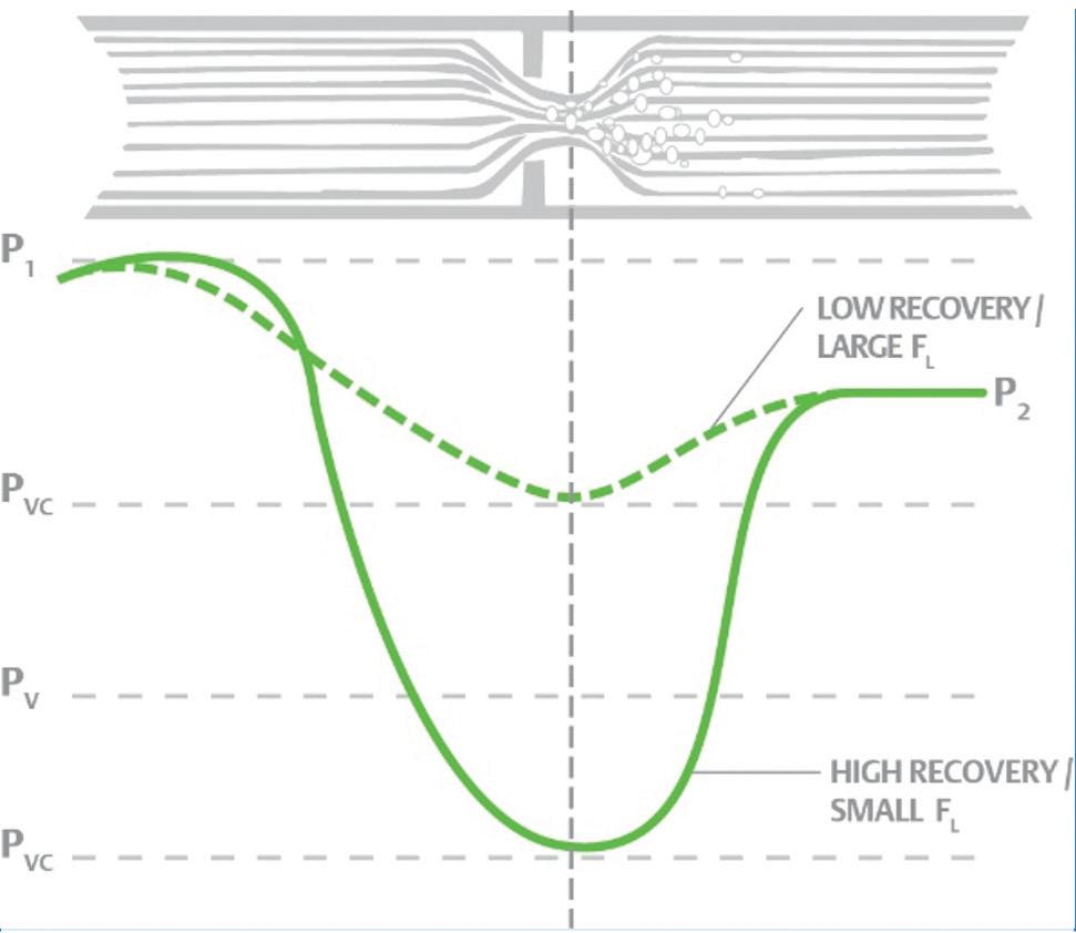 FIGURE 7: This graph compares the vena contracta pressures of a high recovery (ball, butterfly) valve versus a low recovery (globe) valve for the same process conditions. Notice the vena contracta pressure in a high recovery valve is significantly lower, increasing the likelihood of cavitation.