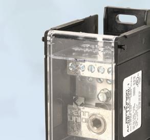Penn Union power distribution blocks feature a modular design that allows for various multi-pole block configurations, providing distribution of power from a single source to various loads. The splicer/reducer blocks allow for in-line splices or conductor size reductions.