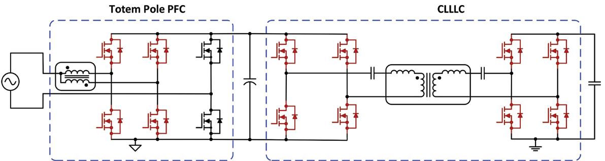 Figure 1 is a simplified schematic of an OBC [1] comprising two stages, both using high-performance GaN switches operating at a high frequency [2]. The first stage is a twophase totem-pole PFC.