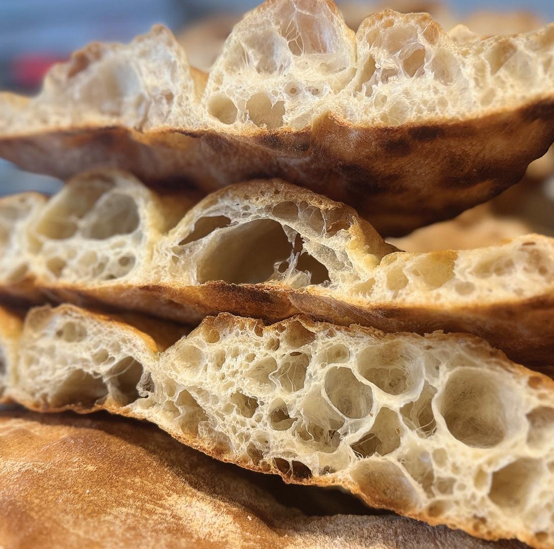 A lot of people want a very open crumb structure—like a ciabatta, where you cut into it and there are big, beautiful air spaces. These air cells are called alveoli, and they’re so good because that’s where the flavor and aroma molecules live. The yeast dies off in the heat and is giving off its last surges of carbon dioxide, expanding, so any of the flavor benefits that the baker has created in fermentation are housed in those expanded cells. Cutting into the air pockets, you’re letting all of that aroma loose, and the flavor has permeated into the cell wall itself. That’s one of the advantages of an open crumb—it releases a lot of aroma when you first cut into it.
