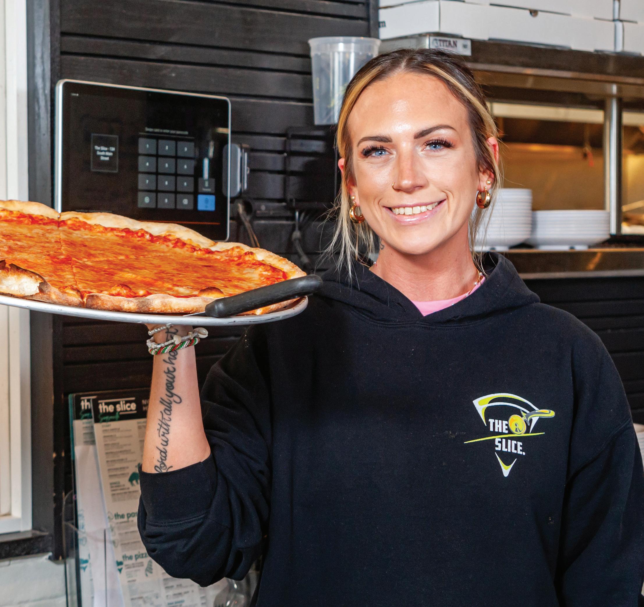 the staff needed on a typical day but essential for the extra 75 guests the rooftop brings. The restaurant also relies on roles often not seen in a pizzeria: barbacks, a utility player for odd jobs (like grabbing ice), and two hosts to keep things moving. Meanwhile, online ordering apps have streamlined operations and quieted the ringing phone. Weekly management meetings keep communication flowing, and building a strong team culture creates a warm, inviting atmosphere for guests. After all, Baldassarra concludes, “It’s our people who make The Slice such a fun place to be.”