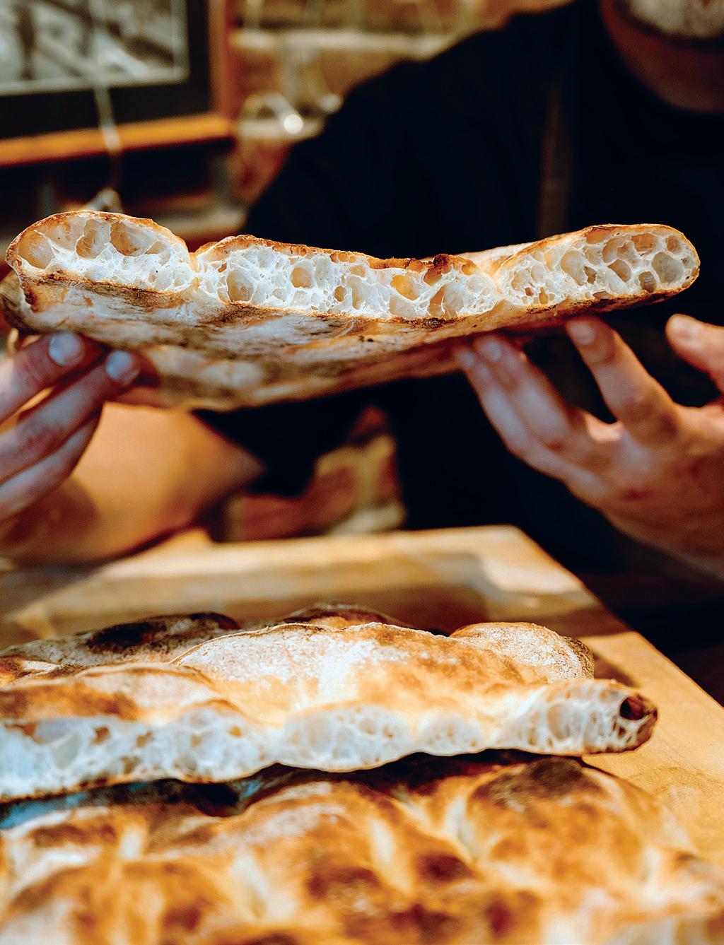 WHAT IS CRUMB STRUCTURE? Let’s limit our discussion to the crown of the dough, or the corona—the ring of crust around the outside. Underneath the sauce, there’s also crumb structure, but that outside part is what Instagram often showcases: the cross-section with the webbing, the strands of gluten, versus how much air is in there. That is crumb structure.