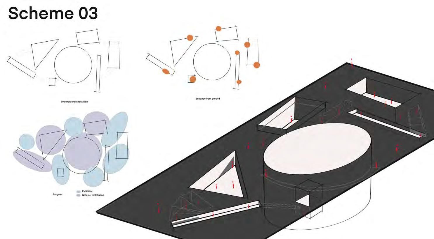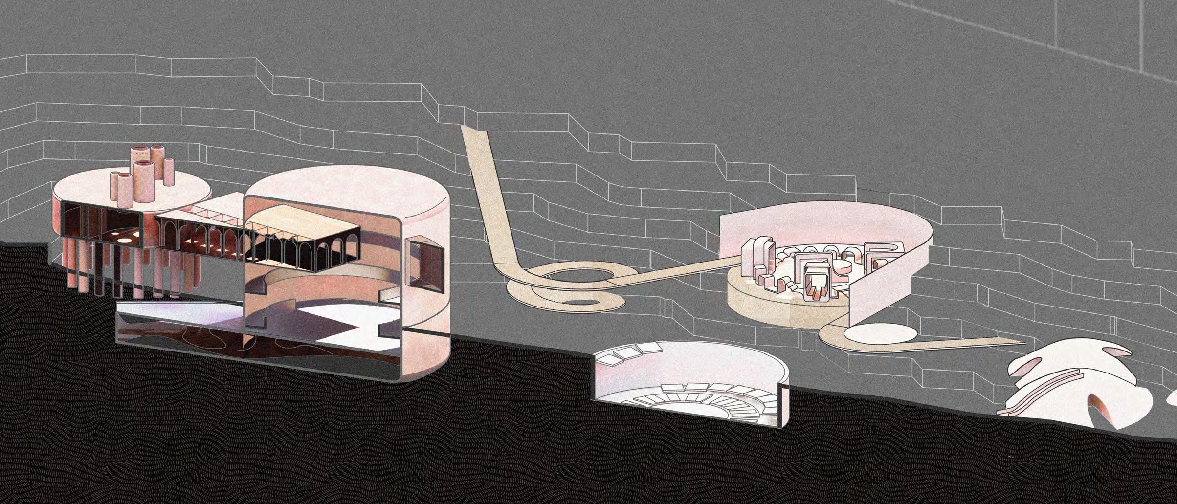 The second scheme only exposes the happiness/joy of pregnancy to the public, so there would be several landscapes/installation embedded in the ground and welcoming people to get in. Meanwhile, all the negativeness of pregnancy - mental issues and physical risks - will be transferred into a spatial experience and hidden underground as circulation.
