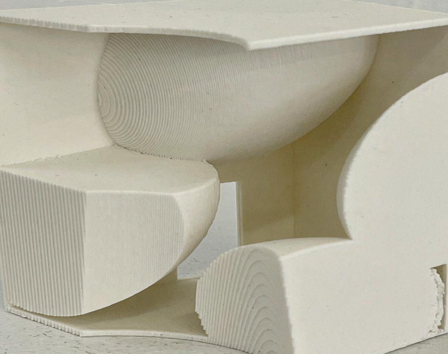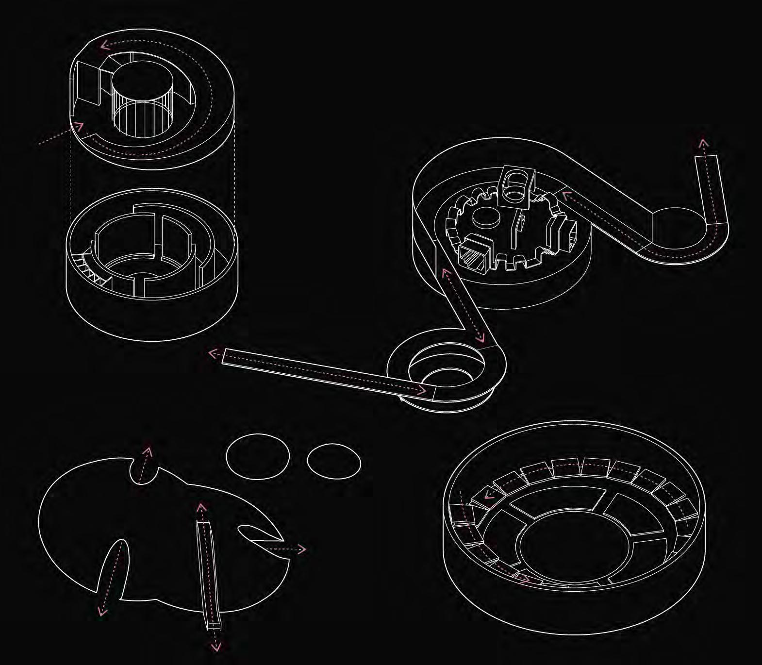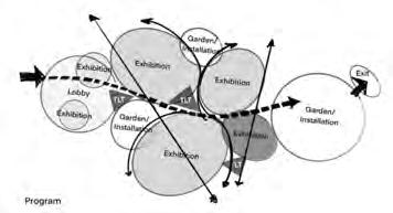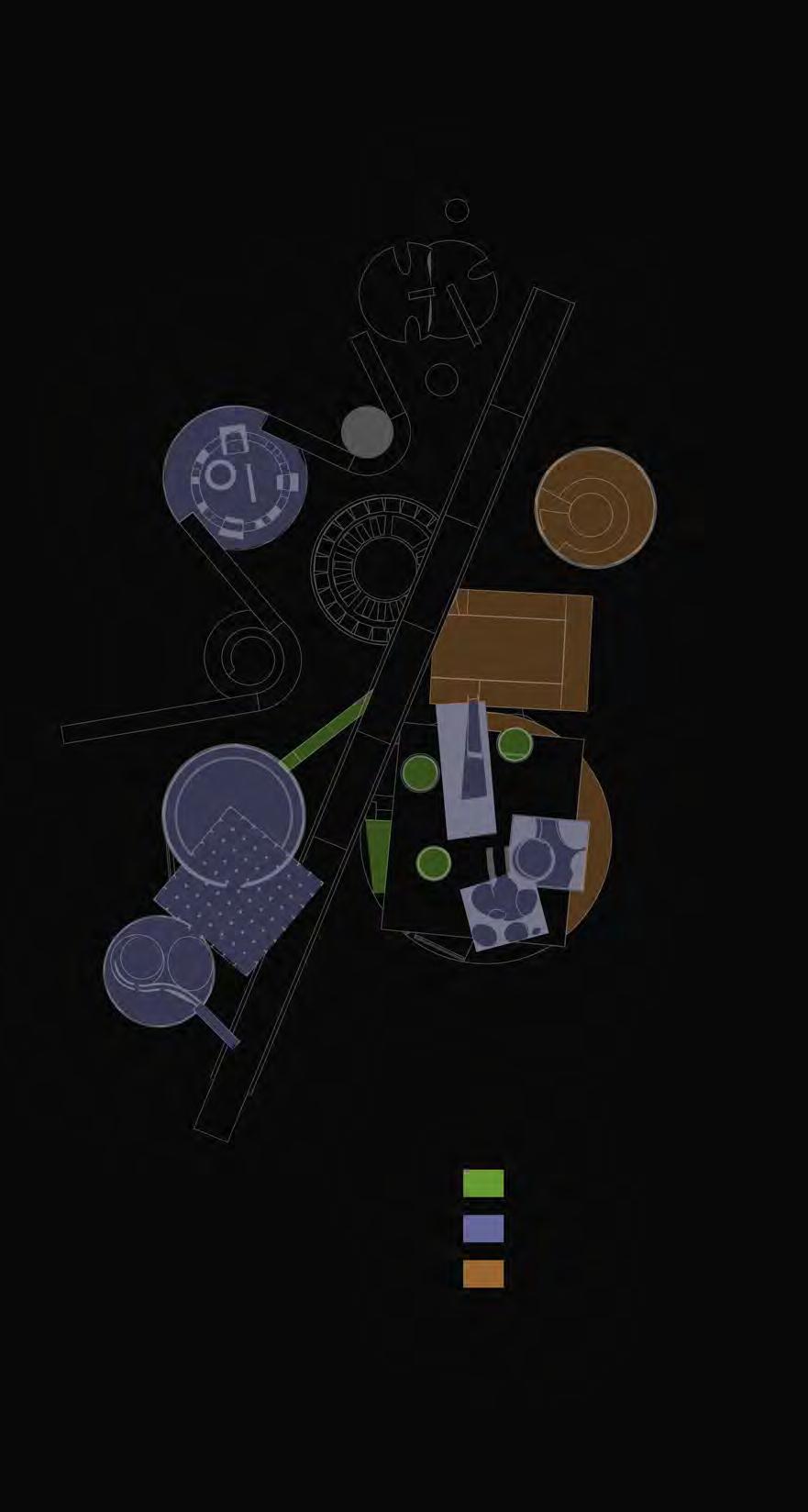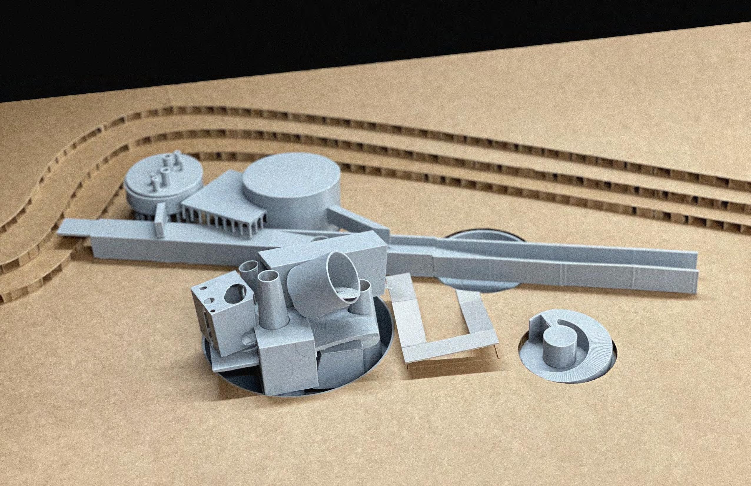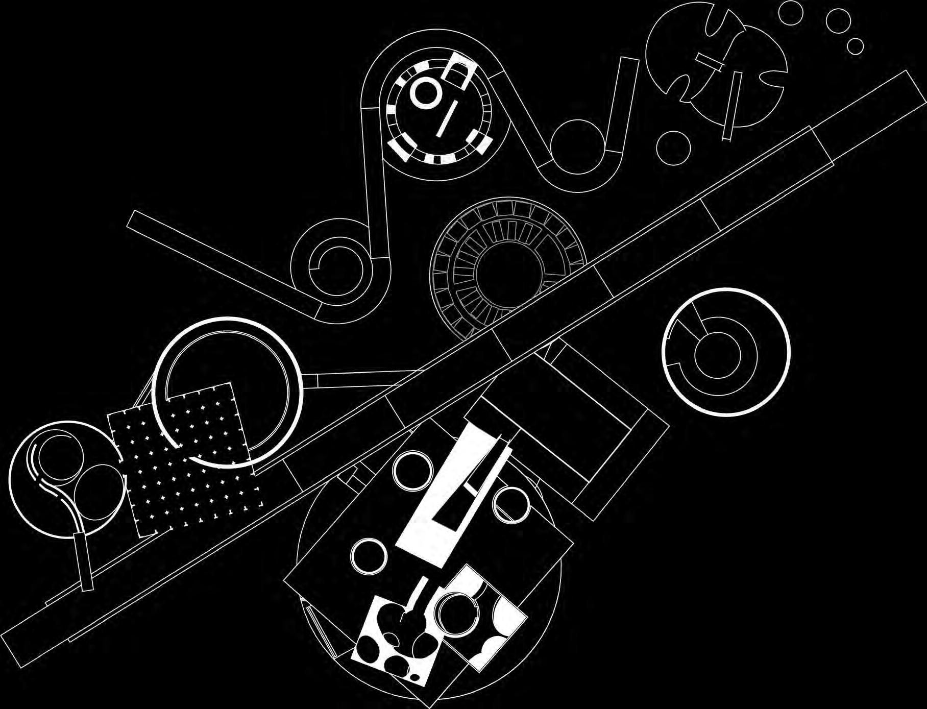 The model comprises four different programs, which represent four key moments from the project. Each of these programs is connected to the others by a formal entrance or opening. The four key moments are: 1) theater; 2) dripping; 3) stretch mark; and 4) swelling.