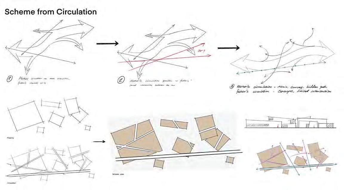 Visitors will start their exploration with a selected circulation mimicking the physical process of being a mother with an interpreting exhibition. The program would also provide a parallel circulation with uneyecatching entrances. Inside would be the exhibition/gallery of mothers' mental issues, which are less exposed to the public.