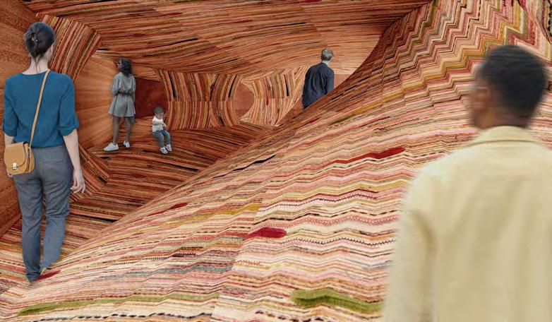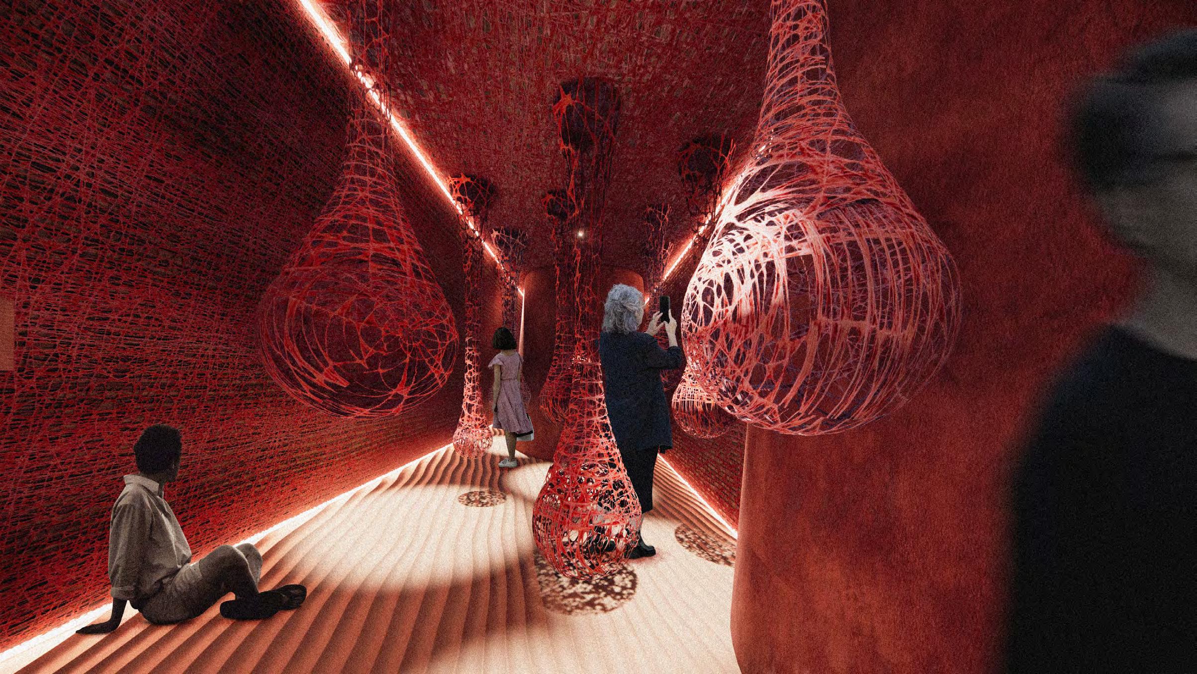 The atrium forced visitors to be exposed to stranger’s sight; the following space is decorated with fabrics to mimick stretch mark and the changing of skin during pregnancy.