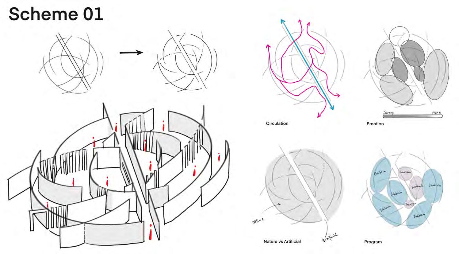 The first scheme, Maze, is a literal exploration of circulation --- a wide and straight path cutting through the maze. At the same time, the rest of the space -- wrapped by curvy partitions -- is inserted with exhibitions of the spatial experiences. The straight circulation represents the father’s perspective, and the cutouts on the wall will only frame the joyful moment(such as nature) of the rest circulations. In comparison, the mother’s perspective is embedded in the curvy and narrow maze. Whenever there’s an intersection between the two, it would be when one decides to participate in the other identity’s life.
