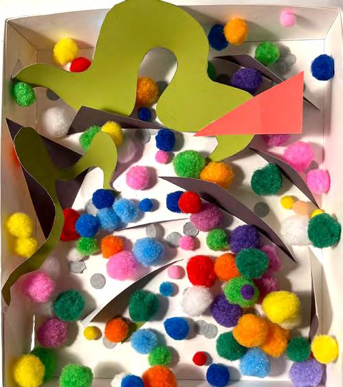 The puff balls represent the sparkled happiness and joy in the early phase of pregnancy. The random green curvy strip is the uncertainty of the future, and the dark triangle means the concern of job security and the pain of delivery.