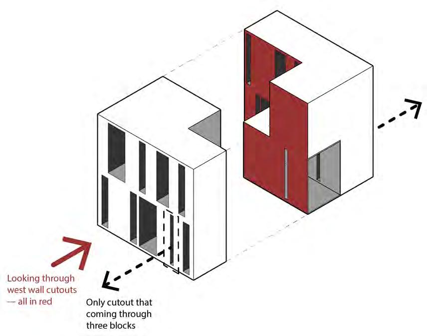 Exploration of circulation is the starting point while playing with perspective is another essential aspect of my project. So I create this concept model to explore the idea further: The pattern and color are different if one looks from an other side. Meanwhile, even though the cutouts share the same color, they do not represent the same wall/surface. And one circulation is hidden within those zigzag surfaces in the same color. Among all the cutouts, only a slim one has cut through all two blocks and become the only entrance/exit that connects two components and circulation in between.