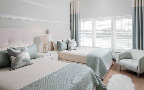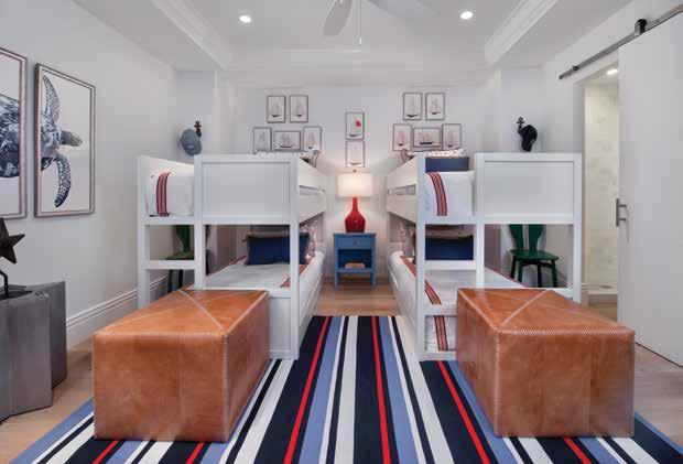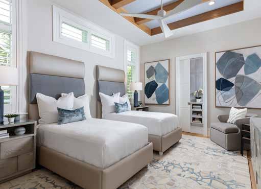 Planning ahead for eventual grandchildren, the owners chose kid friendly furnishings and colors intended for their future family expansion. By the end of the project, the couple’s two grandchildren had made an appearance and the room was ready to welcome them. Twin beds by Blend Home Furnishings have custom faux-leather and Ultrasuede headboards and are outfitted with washable (bleachable) white bedding with marine blue accent pillows by D.V. KAP. The bubble patterned Jaunty rug, in shades of blue, easily disguises stains. Wall art from Leftbank evokes skipping stones in a pond and the Old Biscayne Designs nightstands and dresser are a fun play on puzzle pieces. A corner chair is the perfect place to read a bedtime story and Ambler Art Group +WJC Design provided the whimsical lifelike sculptures of stingrays scooting up the nearby wall. The bath cabinetry glimpsed through the open door has a white Pompeii quartz countertop with a toe kick and pull-out step to help little people reach the sink to wash sandy hands.