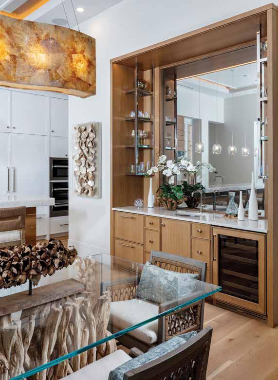 Ruffino Cabinetry built the stunning bar, composed of custom Golden Oak cabinetry, with nickel and glass shelving, complemented by a Melbourne white quartzite countertop, and a built-in wine cooler. But the true showstopper is the two-way mirror at the bar’s back which allows those riding in the elevator to stop at this level and look out onto a stunning view of the Gulf of Mexico.