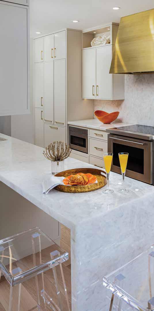 Lighted cabinetry by Ruffino and cut-glass pendants from Ferguson Bath, Kitchen & Lighting Gallery reflect off the iridescent subway tile in this elegant L-shaped kitchen. The custom hood’s cladding is replicated in the knee wall, atop which is a thick slab of Cristallo Prime quartzite, providing both a sturdy surface for the chef and a lovely counter for visitors seated on the Palecek bar stools. In keeping with the latest kitchen trends, many of the appliances are concealed behind cabinetry. The shiplap used in the ceiling adds to the coastal references.