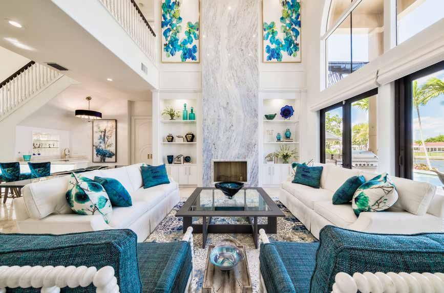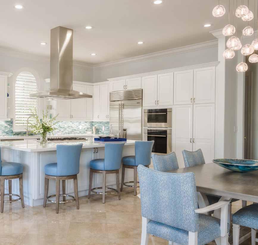 Gathering at the dining room table for lunch or dinner has never been more pleasurable. A large picture window presents a delightful view of the tropical landscaping outside the front of the home, while a tall, majestic indoor plant brings that greenery indoors. Chairs designed in the favorite colors of the owners were manufactured by Century Furniture and the table is an original made by a private label Amish company. “The artwork was the clients’ and part of the inspiration for the home,” explains Lurcott. An eye-catching, extravagant chandelier is part of the same Fine Art Lighting collection and the blue and white patterned area rug, staying true to the colors unveiled throughout, is by the Bokara Rug Company.