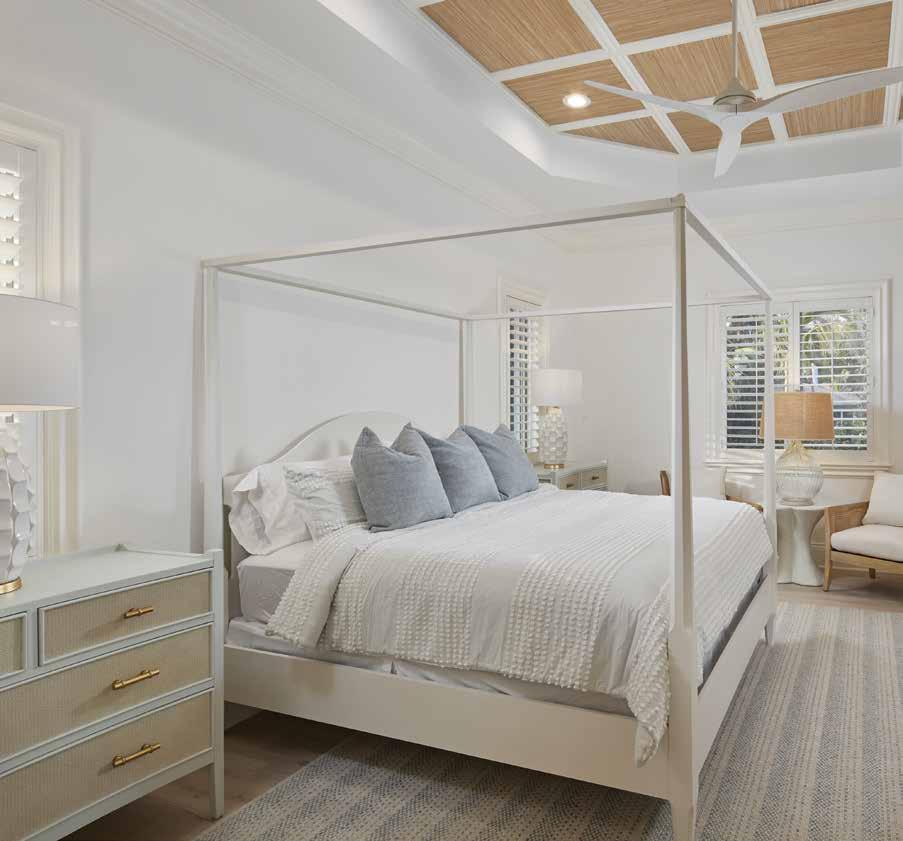 The original master bedroom was dark and needed to be refreshed to create a relaxing and serene space. The tone of the white oak floors has been carried through the furniture thanks to a Universal Home canopy bed flanked by Gabby Home chests with woven insert details. The peaceful colors are picked up again in the grasscloth ceiling details. This design element was already there but painting the trim and the room made it come to life as a focal point. Here, the blues used are softer and more muted to create a restful master bedroom. The custom Stanton-Craft wool rug anchors the space.