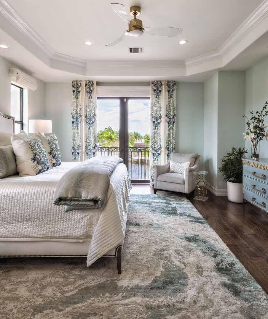Gathering at the dining room table for lunch or dinner has never been more pleasurable. A large picture window presents a delightful view of the tropical landscaping outside the front of the home, while a tall, majestic indoor plant brings that greenery indoors. Chairs designed in the favorite colors of the owners were manufactured by Century Furniture and the table is an original made by a private label Amish company. “The artwork was the clients’ and part of the inspiration for the home,” explains Lurcott. An eye-catching, extravagant chandelier is part of the same Fine Art Lighting collection and the blue and white patterned area rug, staying true to the colors unveiled throughout, is by the Bokara Rug Company.