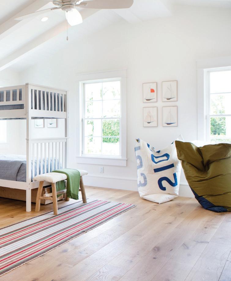 The original master bedroom was dark and needed to be refreshed to create a relaxing and serene space. The tone of the white oak floors has been carried through the furniture thanks to a Universal Home canopy bed flanked by Gabby Home chests with woven insert details. The peaceful colors are picked up again in the grasscloth ceiling details. This design element was already there but painting the trim and the room made it come to life as a focal point. Here, the blues used are softer and more muted to create a restful master bedroom. The custom Stanton-Craft wool rug anchors the space.