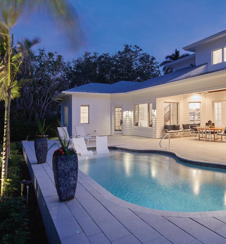 The old lanai featured dark pavers and heavy furniture that made it feel closed in and stuffy. Now it’s light and open thanks to light gray, 12x24-inch pavers, the fresh white paint, and the to-scale furniture. The original teak wood sealing has been stained a darker color to give it a more substantial appearance while the lighter teak wood table below provides seating for six via Summer Classics chairs. The pool was also resurfaced to update the look and create a more functional entertainment area. A fence behind the pool was removed and shrubs and palms added to create a softer look and still affords privacy. Landscape lighting was strategically placed to highlight the new landscaping choices. The space is finished with tall and contemporary planters sourced from Driftwood Garden Center.