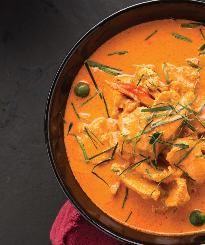 Heat the coconut cream in a soup pot on medium-high heat. Turn the heat to medium, then add the curry paste and garlic. Break up the curry paste, stir and cook until the sauce is thickened and creamy.