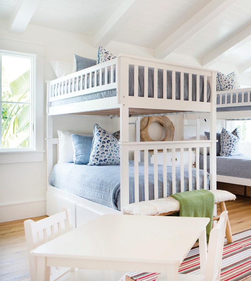 Just off the living room, the home office has been given a complete and fun makeover thanks to the owner’s inability to get a blue room out of her mind. The home was built with quality materials and craftsmanship so the new owners kept the paneling and wainscoting. Originally a dark wood tone with dark wallpaper, the new color is now both soft and vibrant thanks to Benjamin Moore’s Harbor Haze. The blue has a hint of gray and is accented with a simple writing desk by Universal, Gabby Home wicker chairs, and a custom rug by Antrim.