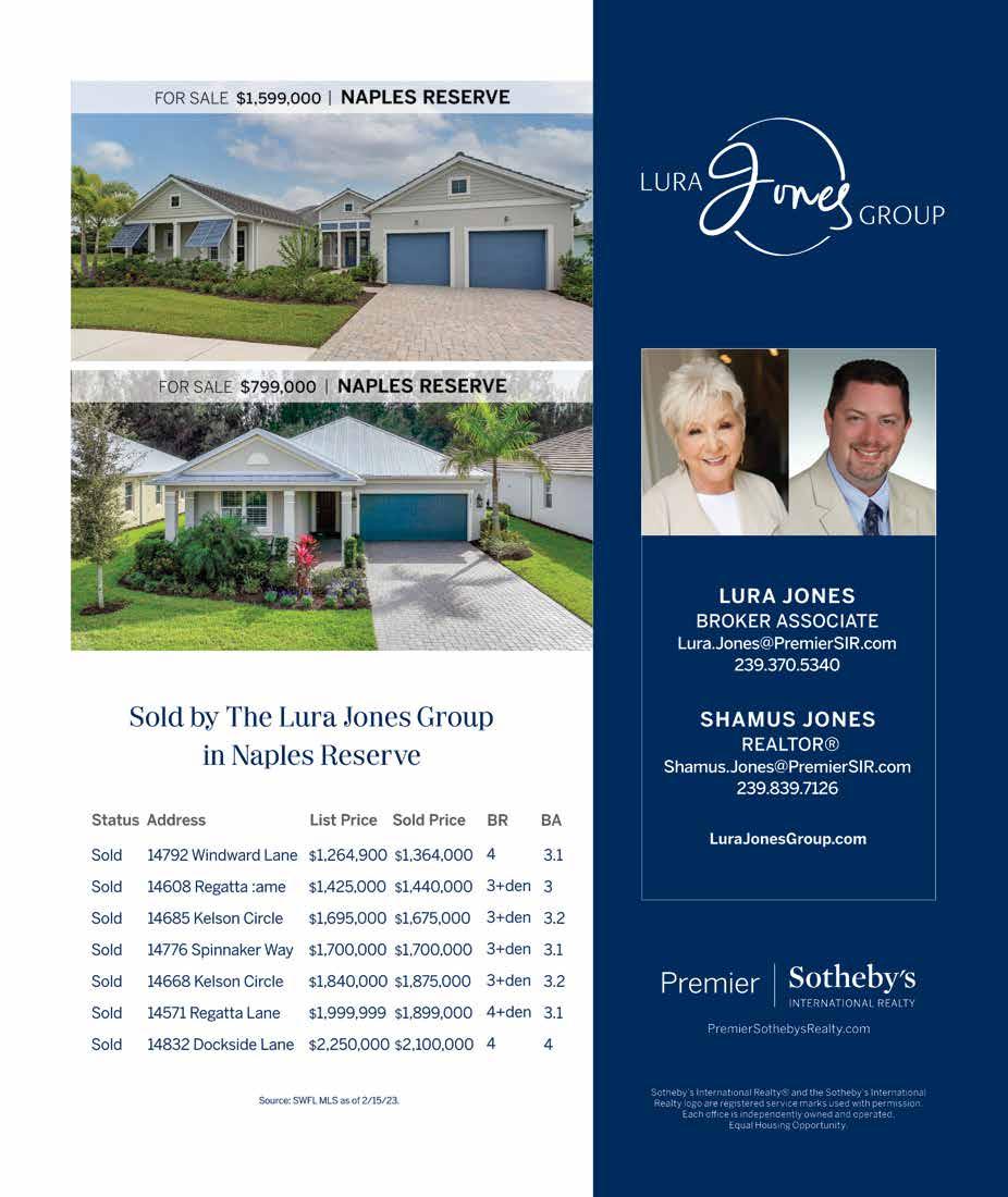 LURA JONES BROKER ASSOCIATE Lura.Jones@PremierSIR.com 239.370.5340 LuraJonesGroup.com SHAMUS JONES REALTOR® Shamus.Jones@PremierSIR.com 239.839.7126 LuraJonesGroup.com