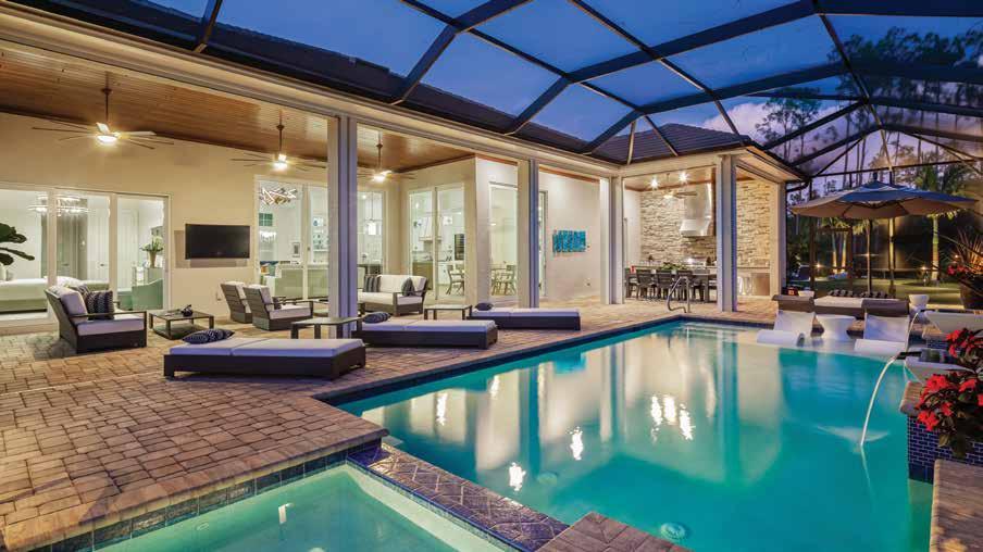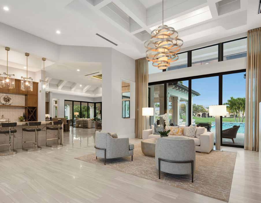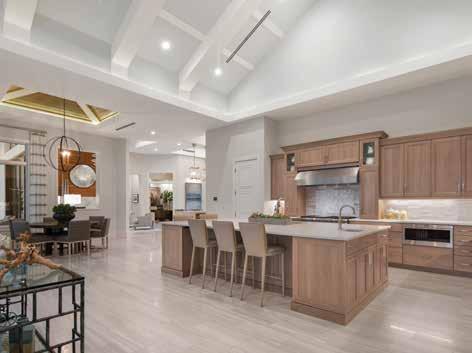 Majestic 3,550 s.f. home offering comfort, and luxury living in Old Naples. The home’s interior evokes relaxed sophistication, with an open and airy first floor surrounding a tropical landscaped courtyard with a pool and raised spa. A double living room and a gourmet center island kitchen - finished with quality materials, custom components and luxury appliances such as a Lacanche dual oven, and sub zero refrigerator. Enjoy ample room for entertaining in a space wrapped around a quaint pool courtyard via 30’ of 9’ high impact sliding glass doors. Access the second level by stair or elevator, to find a generous primary suite with tremendous cathedral ceilings, two additional en-suite bedrooms with walk-in closets, a large openair deck, an office space, wet bar, and fully equipped laundry room. The home is beautifully appointed for stylish entertaining, and is exquisitely located to enjoy all that makes Old Naples such a special place.