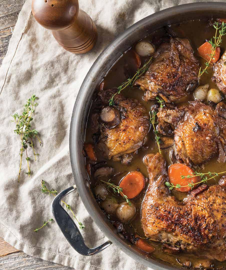 Return chicken to the pot, skin-sides up. Nestle the carrots around the chicken and pour in the chicken stock and wine. Bring to a simmer, then cover and transfer to the oven. Braise for 30 minutes. Remove from the oven.