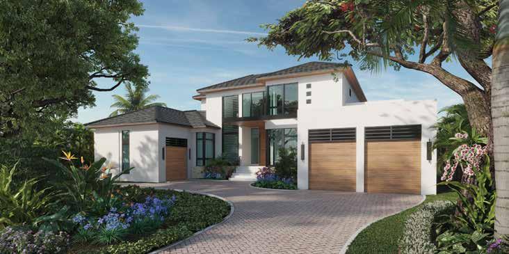 As you approach the home, you are met with an exterior that showcases exquisite craftsmanship as it offers a nod to transitional West Indies architecture. Just enough visual interest has been added with simple corbels and blue painted shutters. This keeps the look more contemporary as it keeps with the coastal architectural theme. Colorful landscaping with tropical hints pops against the slightly off white tone of the walls while dark wood accents pop and add contrast. A wide paver driveway leads to two, two-car garages that create a half courtyard effect thanks to the home’s almost symmetrical design.