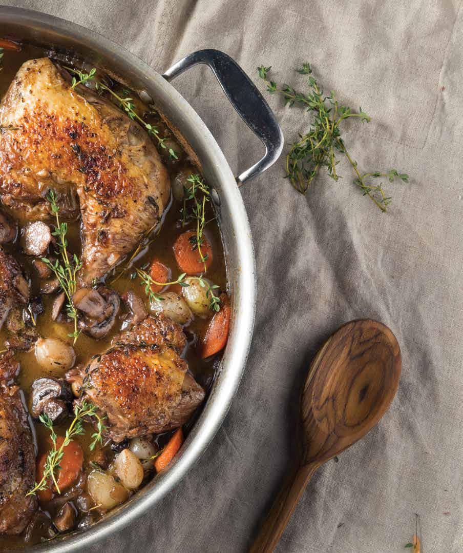 Return chicken to the pot, skin-sides up. Nestle the carrots around the chicken and pour in the chicken stock and wine. Bring to a simmer, then cover and transfer to the oven. Braise for 30 minutes. Remove from the oven.