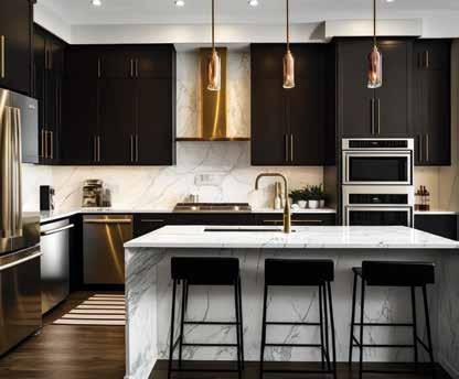 A mesmerizing wood-beaded chandelier above the dining table fashions a fascinating centerpiece, while an impressive island table with waterfall top, constructed with porcelain tile to create a marble look, is designed to be consistent with the overall palette of beige, gray, and black.