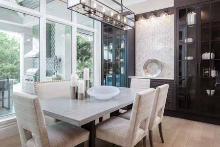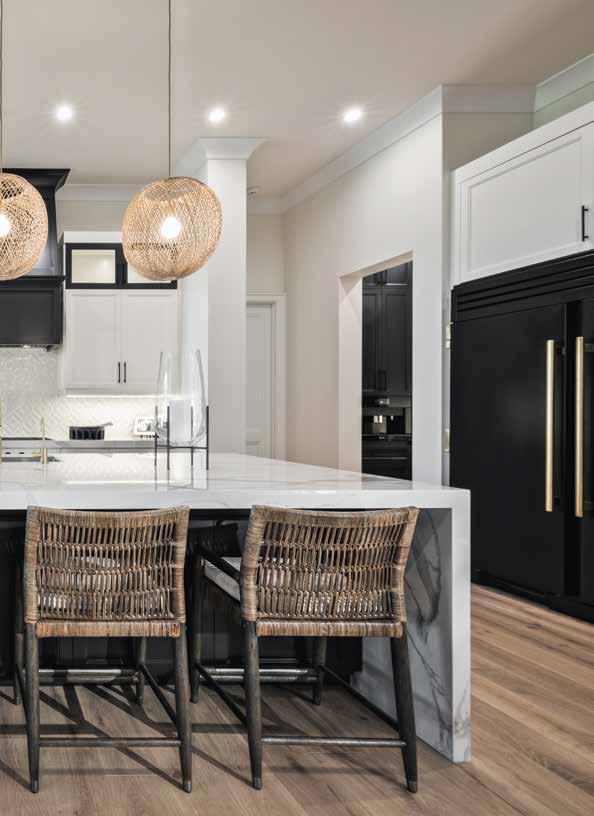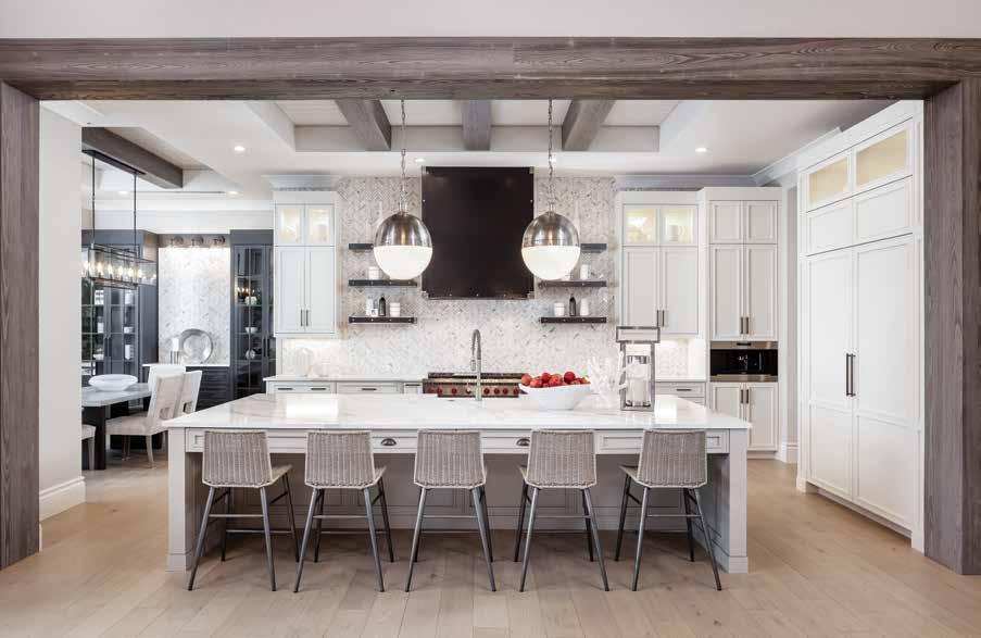 “As far as the design direction, the owners wanted light, neutral colors, natural materials for the furniture and lighting, and a color palette that consisted of tans and light browns with black introduced as an accent, specifically with the appliances,” Brady points out. The designer’s main goal was to create a warm, inviting light, natural feel that family and guests could feel when they walked into the home. “If you think about how interior design is currently trending, it starts on the West Coast and moves to the East Coast—so the home has a transitional, coastal, California feel,” Brady expresses. “The colors and textures that we used are really beautiful.”