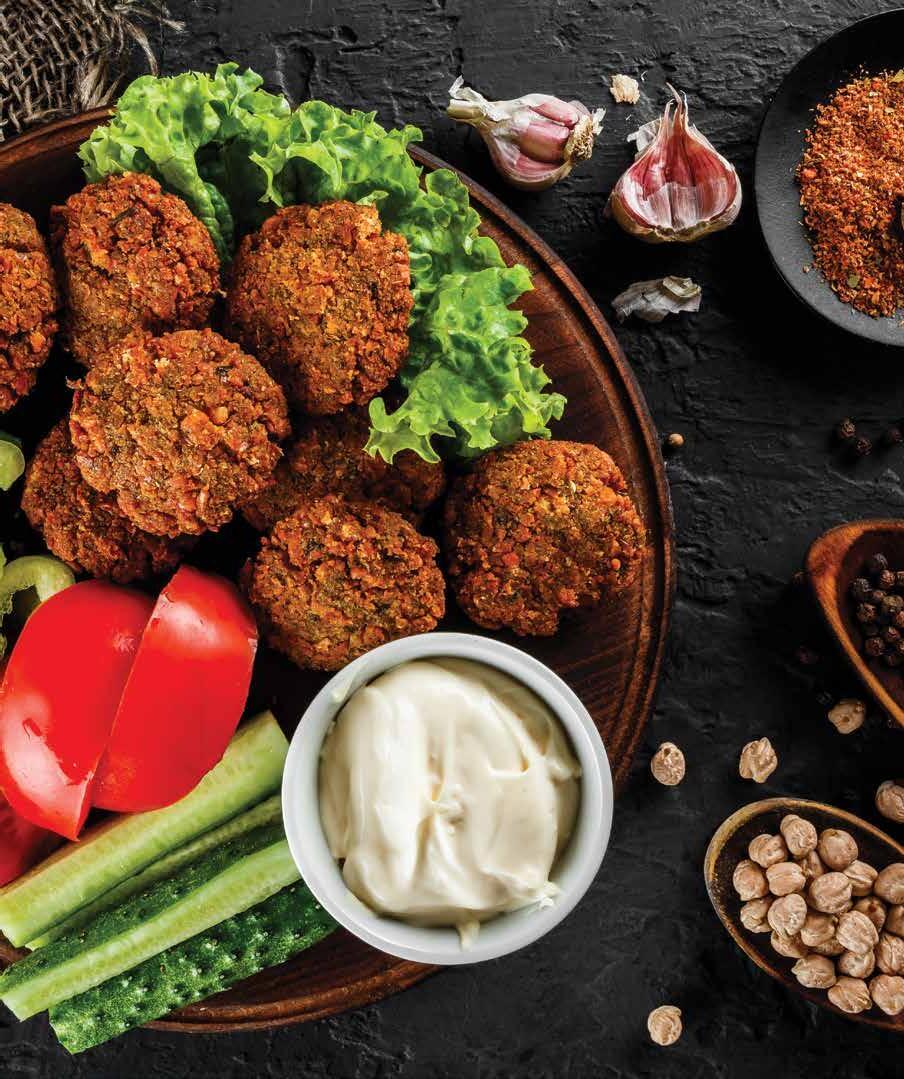 Serve falafel hot next to other small plates; or assemble the falafel patties in pita bread with tahini or hummus, arugula, tomato and cucumbers.