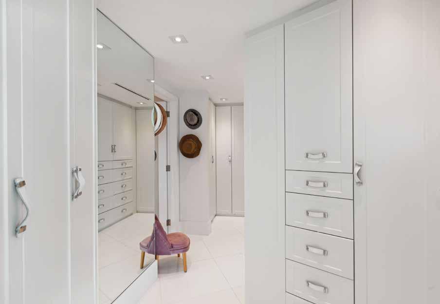“The client wanted a closet that was designed as if you were walking into a boutique,” Brady emphasizes. Mission accomplished! Here, she utilized recessed LED lighting, glass doors and open shelves to shine a spotlight on a grand selection of handbags and shoes. This is one of two closets with the other across the hall housing clothing.