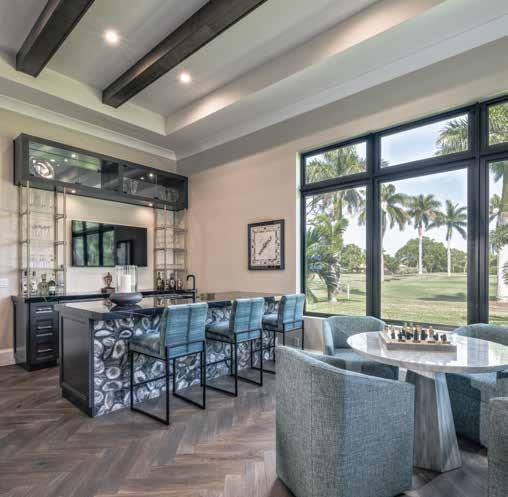 “The wood flooring is consistent throughout most of the house,” adds the designer. “The living room looks out onto the covered lanai with its outdoor kitchen and overlooks the golf course.”