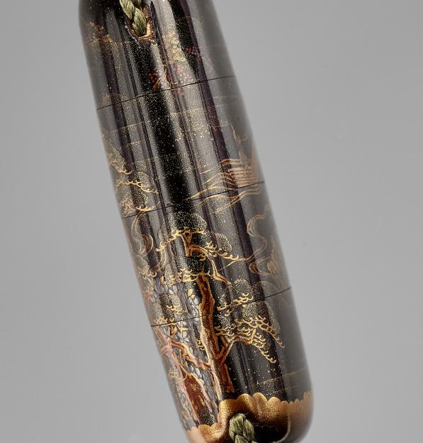 Of rounded rectangular form, carved intricately to each side of the naturalistically textured bark of ebony with a sennin under a thick gnarled pine tree, one side depicting Gama sennin talking in an animated manner to his large toad, the sennin wearing a loose-fitting robe with billowing sleeves, his face in a grimace as he conjures an incantation. The reverse with Tekkai sennin seated on a craggy rock holding on to his cane, his head turned to the side, the face with an intense expression and puffed cheeks as he exhales his soul in the form of a small figure trudging dutifully along in midair, suspended in a cloud-scroll vapor trail. The base incised with the signature KOMATSU MITSUKATA – little known is known about this artist, who appears to have made mostly fine wood inro carved from shitan or ebony and working in the Iwami style.