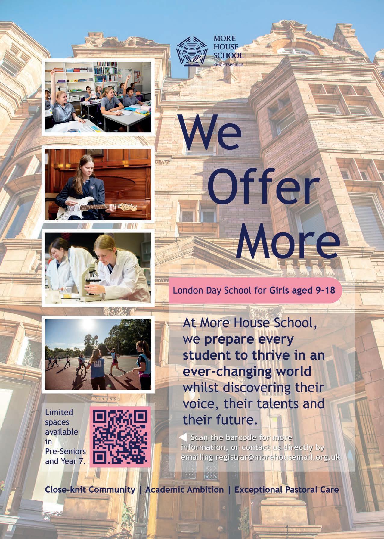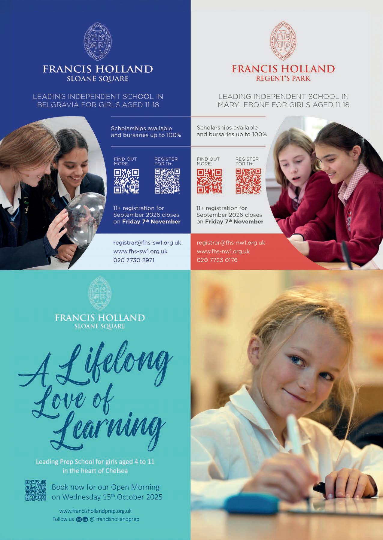 Francis Holland Prep’s location in the original Chelsea Library, just o the King’s Road, enables weekly trips to renowned galleries and museums including the nearby Science Museum, V&A and Natural History Museum. The Prep holds traditional values of compassion, humility and kindness, but its metropolitan outlook instils a unique resilience, dexterity and maturity in girls aged 4-11. This ensures that pupils are ready to embrace their senior school journey, whether they go on to one of the two Francis Holland Senior Schools or other leading London independent schools or boarding schools. francisholland.org.uk