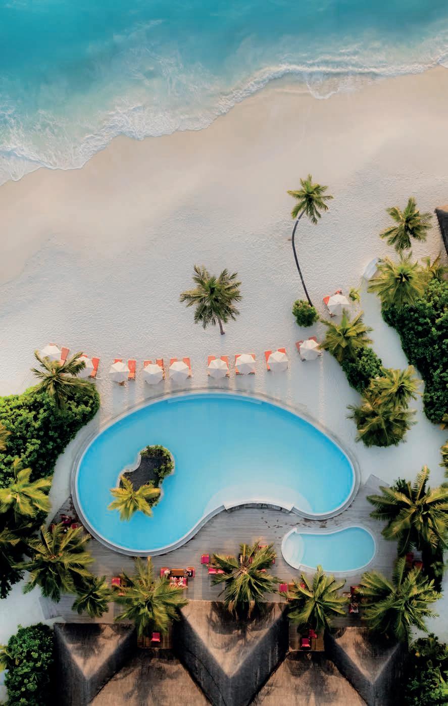 pastimes), we laze by the pool or on the beach, plunging into the balmy waters for a revitalising cool down. We indulge in blissful massages in the serenity of the spa and take sunset walks on the beach. It’s a slice of heaven bathed in shimmering blues and brilliantly cooling whites. We never want to leave.