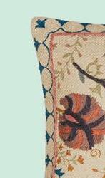 Kit Kemp's Flower Power cushion features a beautifully detailed appliqué pink fl ower on a branch, fi nished with a blue herringbone piping for a playful touch. kitkemp.com